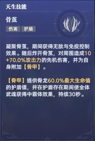 骨龙可以提供高额的护盾和最终伤害减免,极大地提升了我们的生存能力。骨龙的先机可以为自身附加【骨甲】,提供骨龙60%最大生命值的护盾,并让全体武魂在护盾存在期间霸体。而骨龙的两个被动又能对【骨甲】进行强化,得到不同的效果。