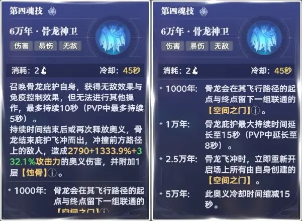 召唤骨龙庇佑自身,获得无敌效果与免疫控制效果,但无法进行其他操作,持续10s。第四魂技的技能CD 45s,提高星级可以延长无敌时间和降低技能冷却,无敌时间的占比非常高,非常适合PVP。