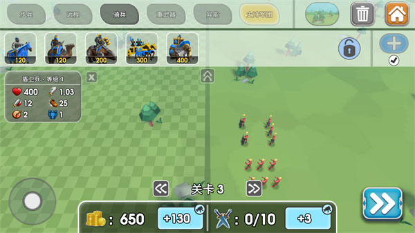 2、在这里我们可以选择步兵、远程、骑兵、重武器、异能等多种分类,点击要上场的兵种,选择好之后再点击一下放置的格子就可以上场了,如果想要换下场上的棋子,只需要再点击一下就好了;在这里要注意的是近战放前面抗伤害,远程放后面打输出;