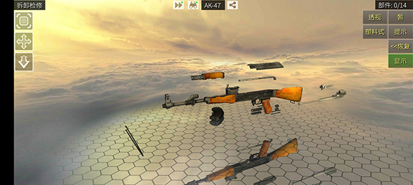 4、在“拆卸检修”模式里您可以练习型的拆卸和检修(也就是说,把型部分地拆卸下来,进行清理和维护)。点击一个零件如果它能够拆卸,那么在它旁就会出现一个绿色的箭头,且右下角会出现“激活”按钮。点击绿色箭头零件身,或者点击“激活”按钮都会拆卸选定零件。如果您弄不清楚那个零件可以拆卸,试着点击“提示”按钮,拆卸的零件数和总零件数会在右上角显示。完成此型的“完全拆解”式会解锁对应的“组装”式,要了解如何控制视角,点击“视角和型控制”按钮。