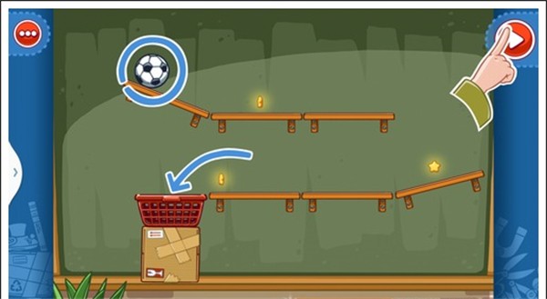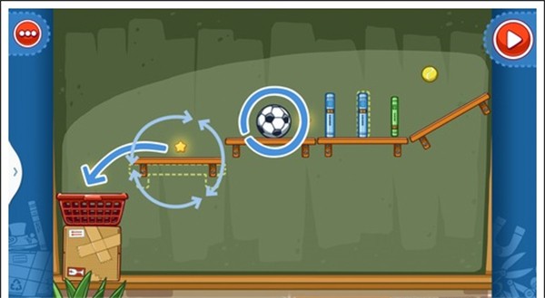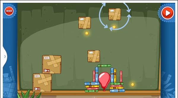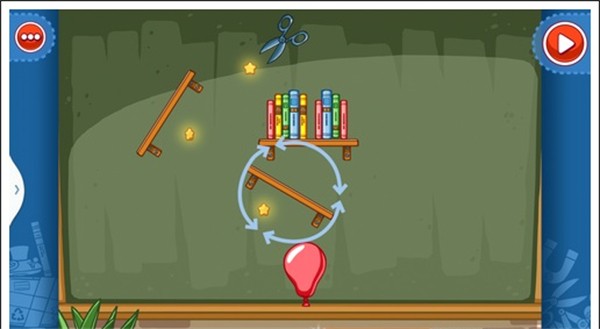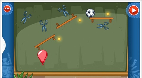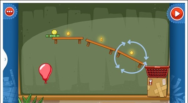 我们只需要将两个板凳放入图中所示位置,和一个气球放在那个书本底下,就可以让球滚下,获得星星。