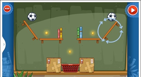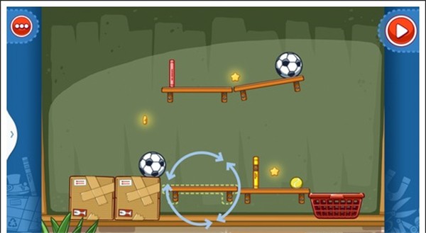 我们只需要将两个木板凳放在斜放在两侧,气球放在足球下面,这样使气球飞上去,碰到足球这样就能获得星星。
