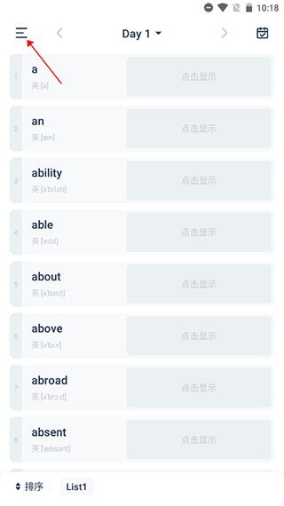 1、打开炭炭背单词app后,点击页面左上角【三图标】。