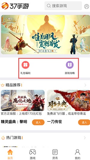 1、在本站下载安装37游戏盒子手机版,运行软件,可以看到有首页、游戏资讯、我的四个板块;