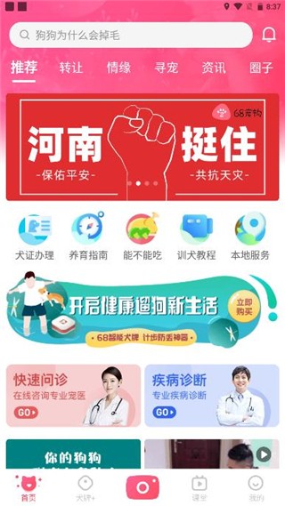 68宠物是一款由湖南纳九物联科技有限公司开发运营的宠物服务类应用程序,可通过App提交犬只免疫证明、身份信息等材料,在线完成养犬许可证的申请、变更、注销等政务流程,支持选择就近的养犬许可免疫便民服务点办理智能犬牌植入业务。提供宠物话题互动、萌宠秀分享等功能,可以与其他铲屎官交流养宠经验与技巧,同时提供宠物挂失功能,一旦宠物丢失,用户可以迅速发布挂失信息,增加找回宠物的机会。