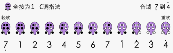 最后介绍一种全按(不包括食指所负责的那两个小孔)为低音4的指法,可以吹出低音2到中音6的音阶。不过这种指法因为含盖的音域有限,所以很少使用。