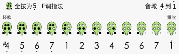 下面的指法是全按(不包括食指所负责的那两个小孔)为低音5的指法,可以吹出低音3到高音1的音阶,可以覆盖大部分的常见的曲子。