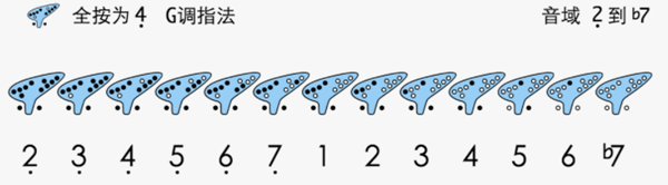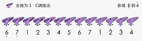 最后介绍一种全按为低音4的指法,可以吹出低音4到中音6的音阶。如果配合一定的技巧,可以吹出低音3。不过这种指法因为含盖的音域有限,所以很少使用。C调陶笛用该指法吹出来的是G调。